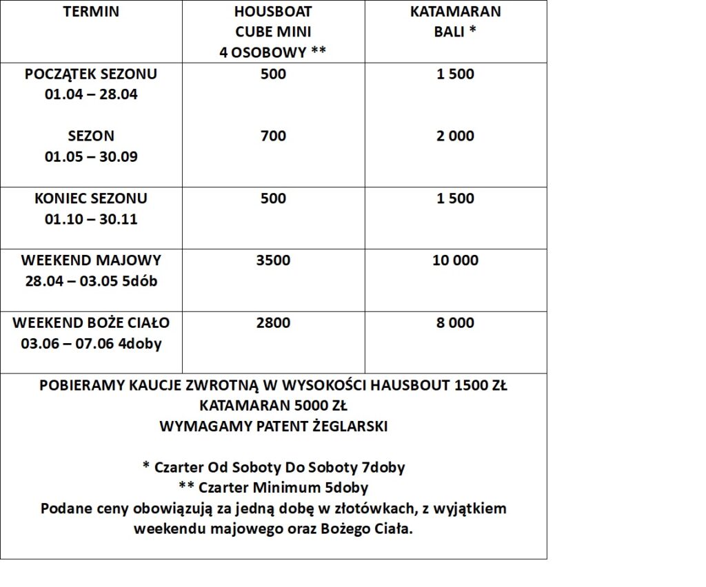 Cena dotyczy wynajmu jachtu lub houseboat na jedną dobę czarterową